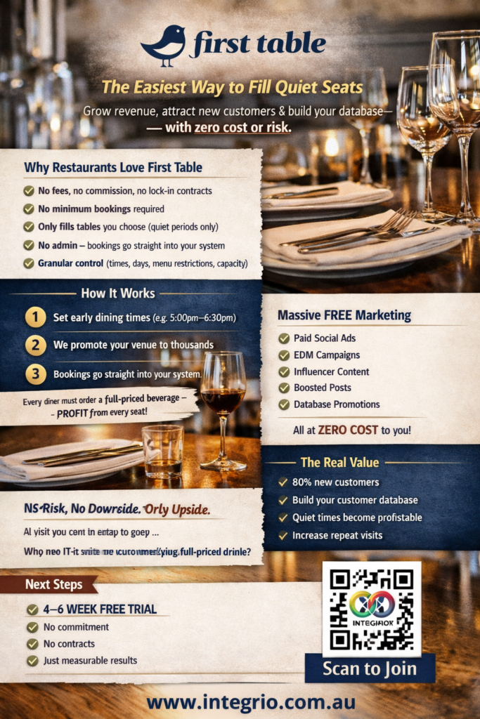 First Table helps restaurants attract new customers during quieter periods — without fees, commissions, or contracts.